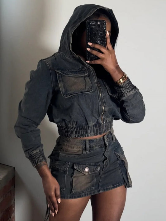 Women's Multi-Pocket Denim Hooded Cargo Skirt Set for Casual Streetwear