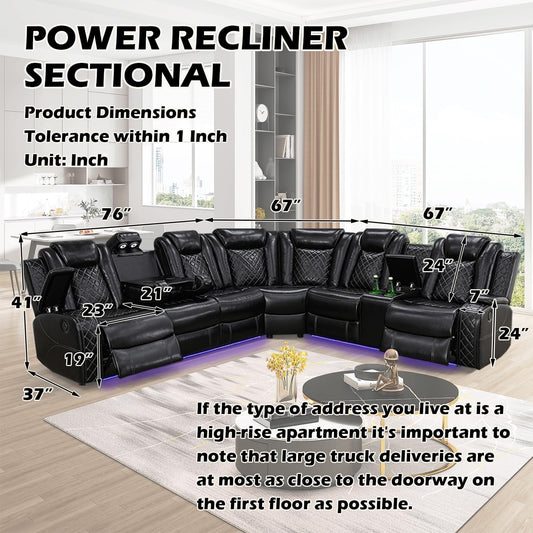 Luxurious Black Leather Sectional Sofa with Power Recline, LED Lights, Storage Ottoman