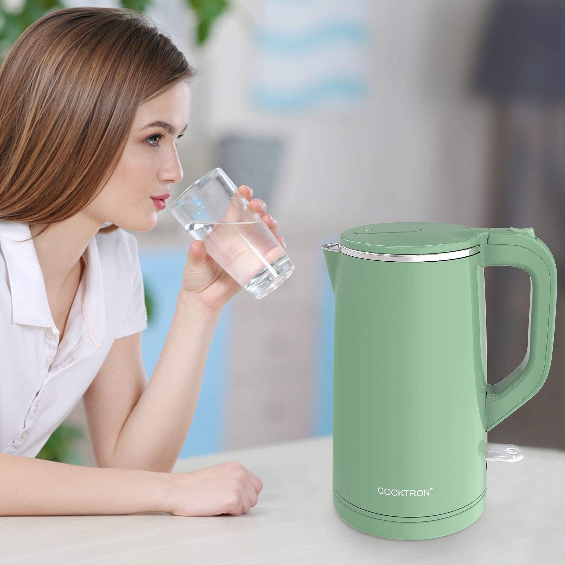 COOKTRON 1.7L Electric Kettle Quiet, Double Wall Hot Water Boiler BPA-Free, Quiet Boil and Cool Touch Tea Kettle, Cordless with Auto Shut-Off & Boil Dry Protection, 1500W Fast Boiling, Green