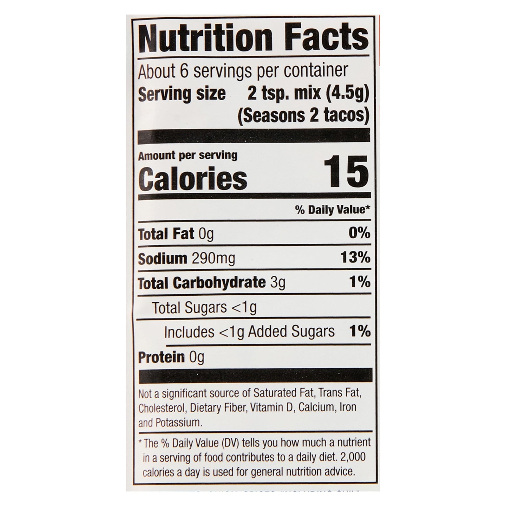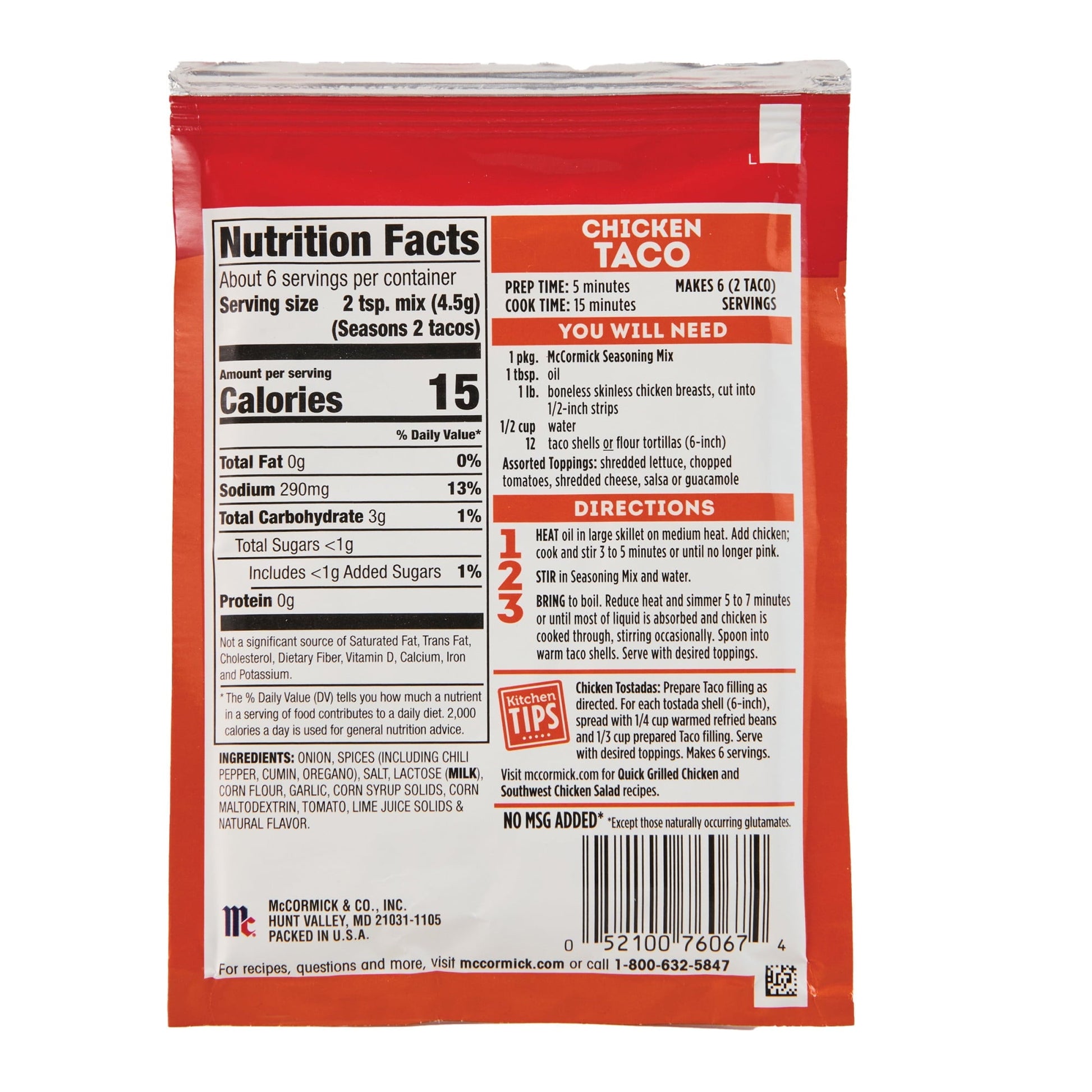 McCormick Chicken Taco Seasoning Mix is a zesty blend of authentic Mexican seasonings that's certain to turn ordinary chicken into a fiesta of flavor. Ready in 20 minutes are family-friendly tacos that’re perfect for busy weeknights.With this tasty blend of McCormick herbs & spices, including onion, chili pepper, cumin and oregano, it's easy to turn a few ingredients into a feast! Simply sauté chicken, simmer with the mix and water, then spoon into taco shells with your favorite fresh toppings. And it’s more than just a taco mix, try in tostadas, grilled chicken, dips and more. Our seasoning is made with no artificial flavors or added MSG*, so you know you’re serving nothing less than the best.*Except those naturally occurring glutamates. This McCormick® Chicken Taco Seasoning Mix is in a Paper packet that is 1 ounces. Store this shelf-stable item at an ambient temperature. *- Zesty blend of onion, chili pepper, cumin and oregano *- For family-favorite tacos that are ready in 20 minutes *- McCormick Chicken Taco Seasoning Mix has no artificial flavors or added MSG* *- Made with an expert blend of McCormick herbs & spices *- For more than just tacos; try in tostadas, grilled chicken, dips and more *- Convenient seasoning packet to keep on hand in your pantry