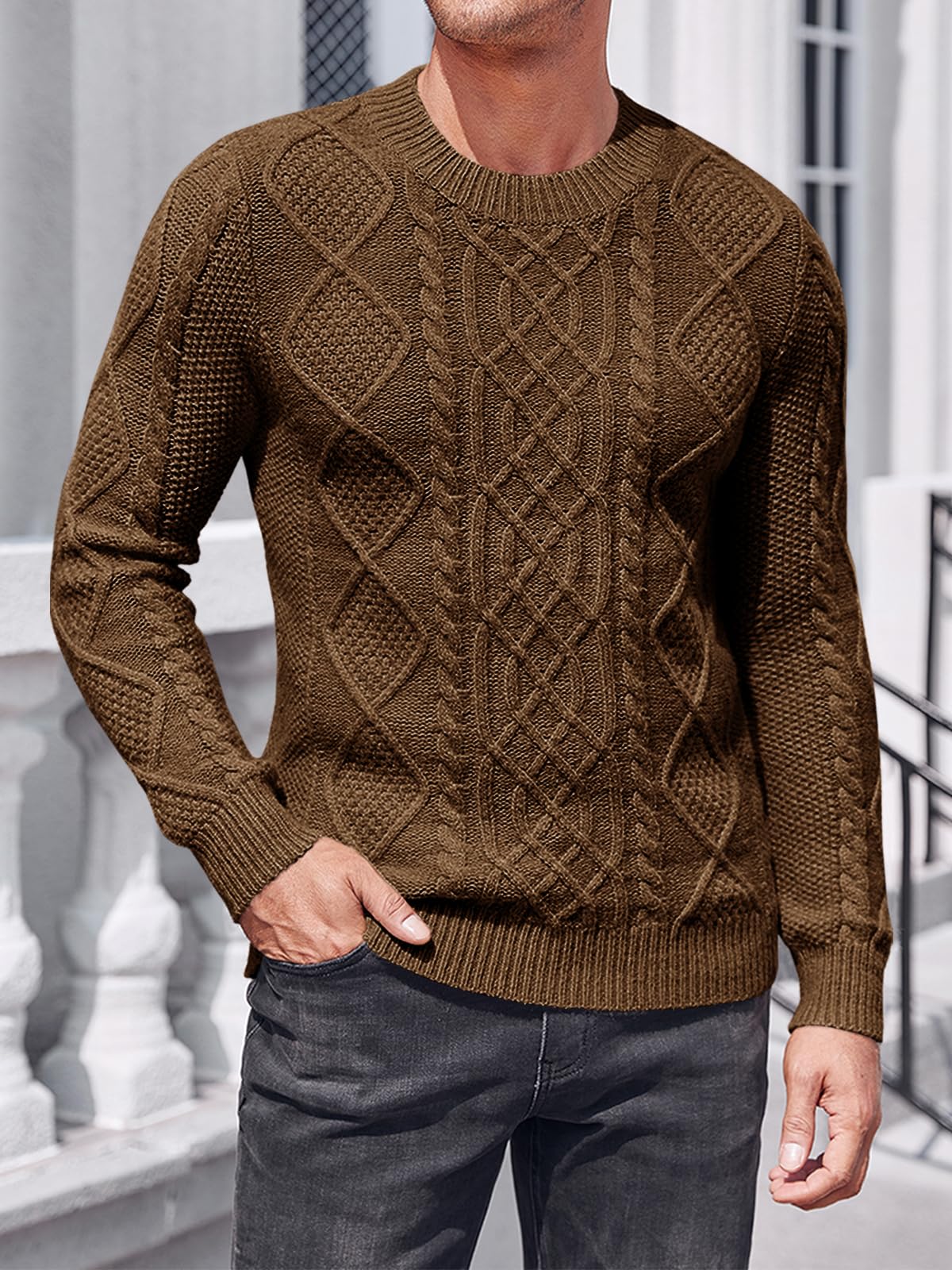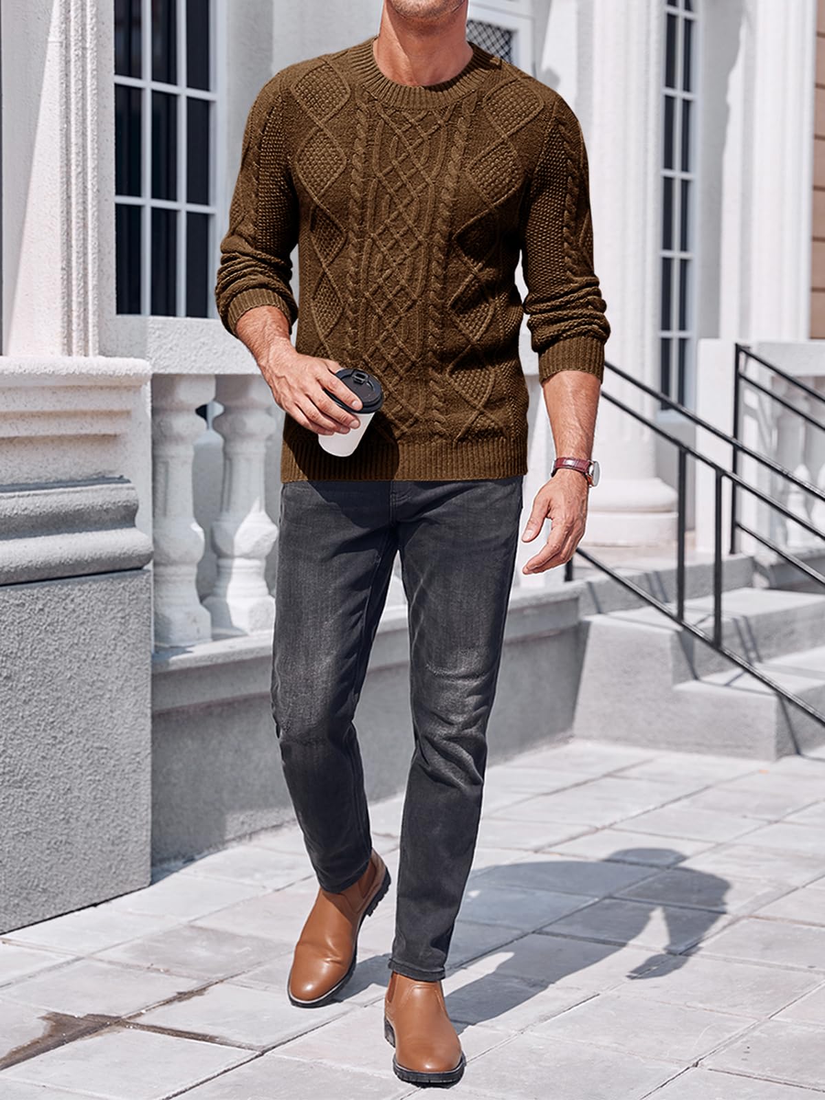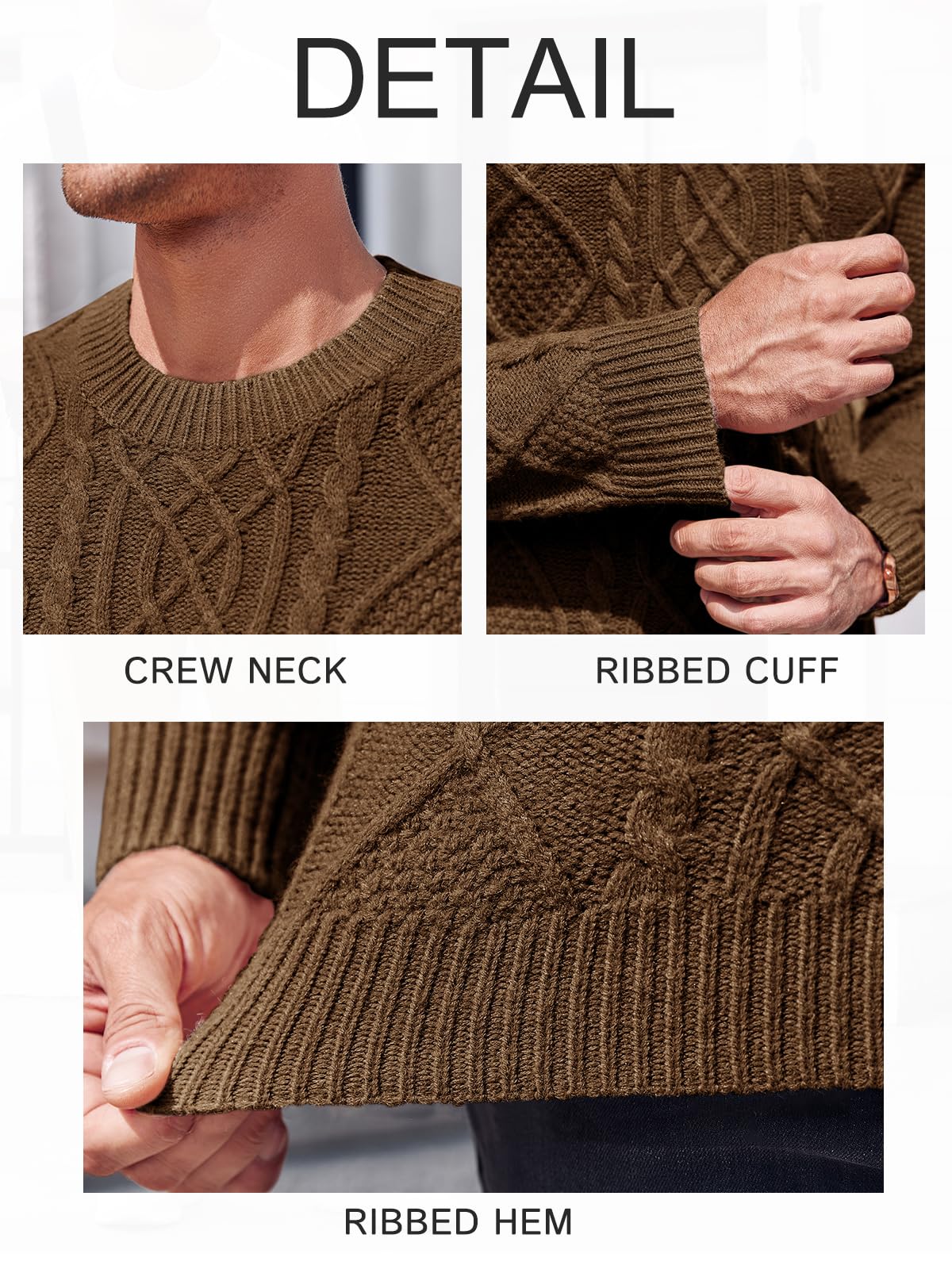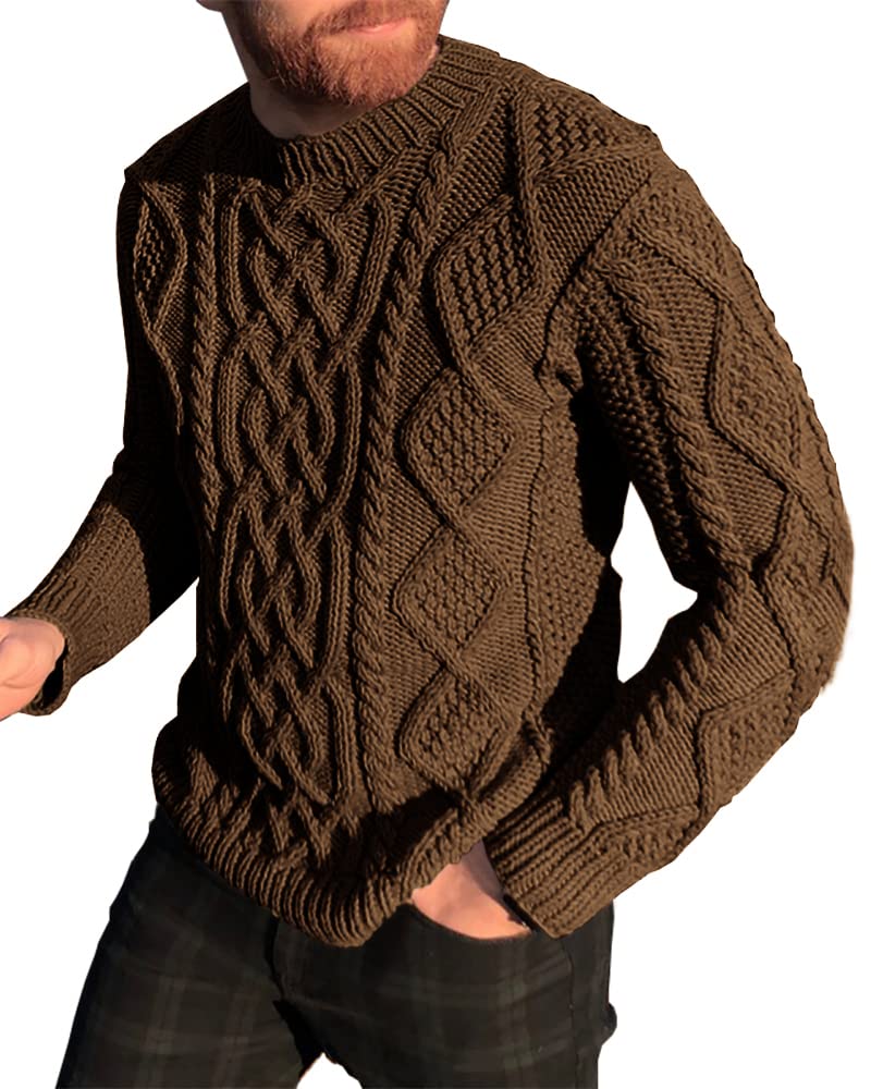 NIUBIA Men's Slim Fit Crewneck Pullover Sweater Winter Casual Chunky Cable Knit Comfort Heavy Long Sleeve Sweaters Brown