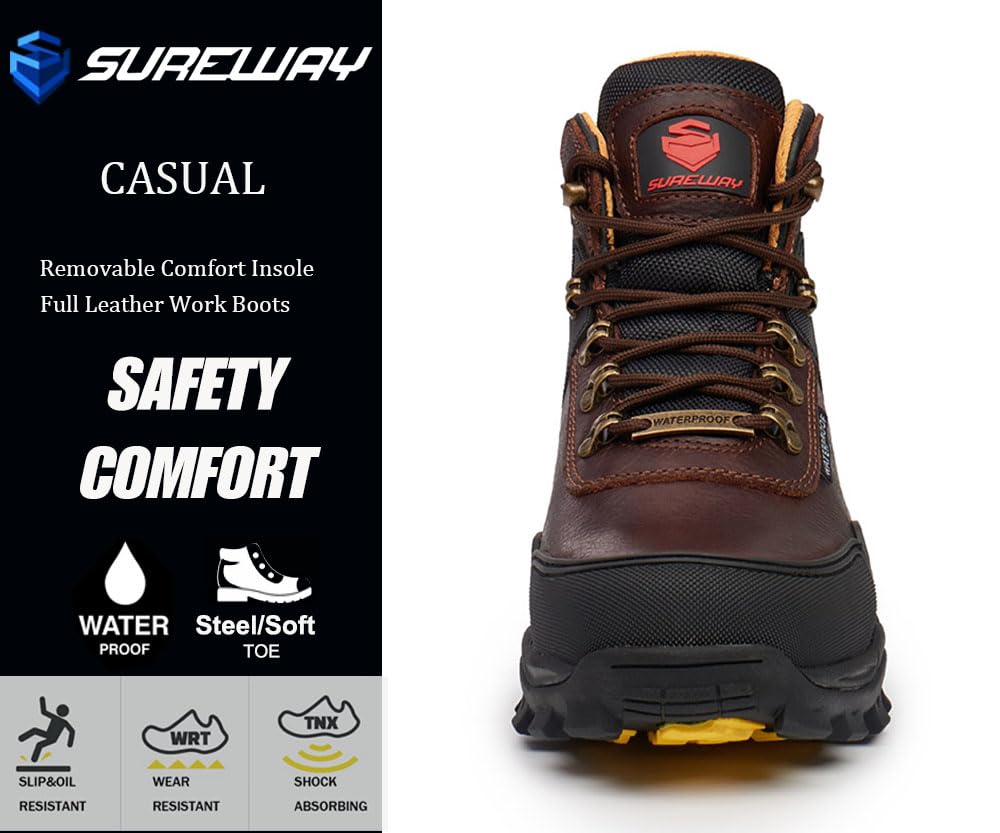 - Steel Safety Toe :protection against impact and compression hazards with a metallic safety toe. Steel safety toes meet ASTM F2413-18 standards.SUREWAY Steel Toe water proof work boots for men is ensures optimal comfort and support throughout the day.True to size.Please go up half a size if you have a wide feet.