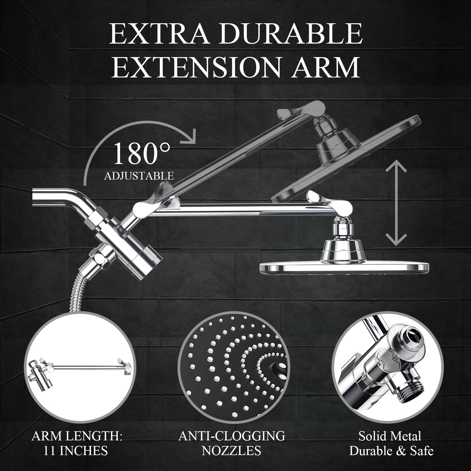 - Stainless Steel Adjustable Extension Arm. Ultra Durable Extension Arm and Featuring an adjustable swivel ball connector, our deluxe shower head is attached with solid brass joints for ultimate customization and durability. Tilt and turn with ease to find the perfect angle for your next shower.