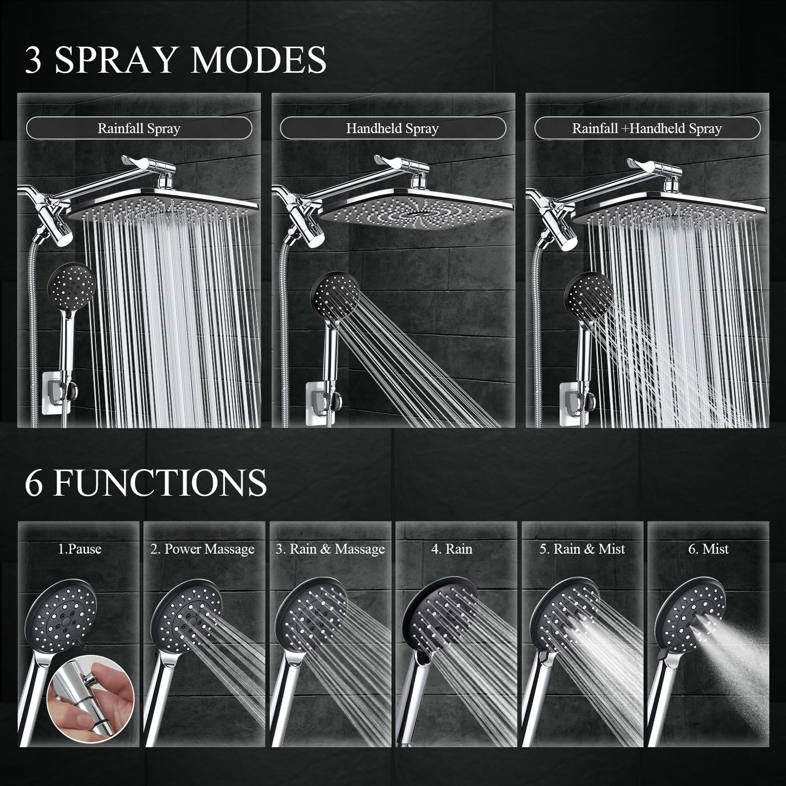 Veken High Pressure Rain Shower Head Combo with Extension Arm- Wide Showerhead with 6 Handheld Water Spray - Adjustable Dual Shower with Anti-Clog Nozzles - Silver Chrome